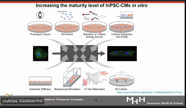 在此次研讨会中,Dr. Chatterjee聚焦心肌病变研究中引入干细胞技术的必要性,为同学们细致地讲解了如何培养人类诱导多能干细胞来源的心肌细胞,并提出多维调控手段,如长时间培养细胞、激素干预调控、生物物理刺激、3D培养构建空间结构等都能够显著提升hiPSC-CMs的成熟度,使其更接近成体心肌细胞功能。