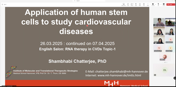 继首次线上学术研讨会的成功举办并取得良好反响后,麦田影院 于2025年4月7日开展“Gene Therapy in Cardiovascular Diseases”系列第二场线上学术研讨会。本次研讨会的主题是: Application of human stem cells to study cardiovascular diseases,聚焦诱导多能干细胞衍生心肌细胞(iPSC-CM)在心血管疾病治疗中的前沿应用,特邀德国汉诺威医学院转化科学家Shambhabi Chatterjee博士担任主讲嘉宾,由本院青年研究员吕东潮博士邀请嘉宾出席,并由22级中药学专业郑雨轩同学担任主持。