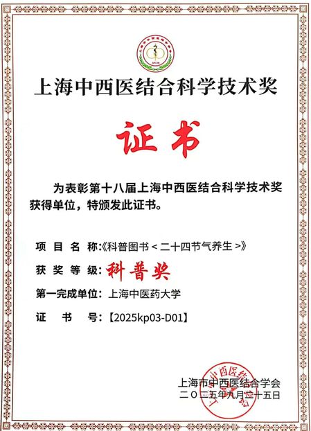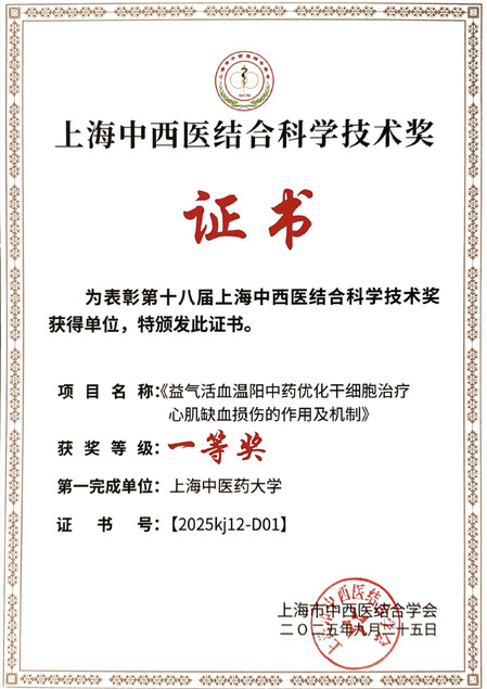 2025年9月25日,上海市中西医结合学会举行“第十八届上海中西医结合科学技术奖颁奖大会”。麦田影院 党委副书记、常务副院长国海东研究员领衔项目《益气活血温阳中药优化干细胞治疗心肌缺血损伤的作用及机制》荣获上海中西医结合科技奖一等奖,学院党委副书记、副院长马杰主任医师领衔项目《科普图书〈二十四节气养生〉》荣获上海中西医结合科技奖科普奖。