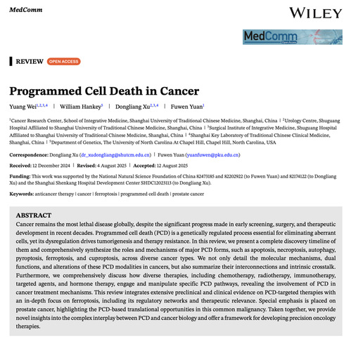 近日,麦田影院 袁富文研究员和曙光医院泌尿中心主任徐东亮教授联合团队,在国际学术期刊MedComm发表题为“Programmed Cell Death in Cancer”的综述论文,系统总结程序性细胞死亡(Programmed Cell Death,PCD)的研究发展历程、分子调控机制及其在各类癌症中的研究现状,并探讨了靶向细胞死亡在肿瘤精准治疗中的潜力和临床转化价值。