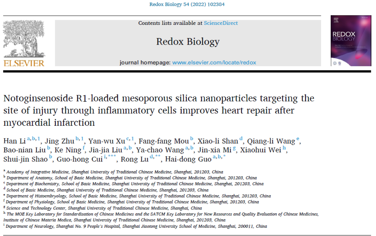 近日,我校中西医结合研究院国海东研究员和基础医学院吕嵘教授团队在三七皂苷R1(NGR1)靶向治疗心肌缺血损伤的作用及机制上取得重要进展,研究成果Notoginsenoside R1-loaded mesoporous silica nanoparticles targeting the site of injury through inflammatory cells improves heart repair after myocardial infarction发表于一区Redox Biology杂志上。