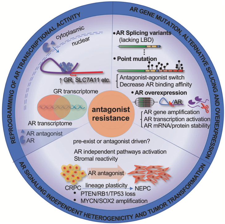 AR二代拮抗剂作为国际上CRPC患者临床治疗一线药物,在一定程度上提高了患者整体生存期和带病生存期。然而,越来越多的证据表明AR二代拮抗剂的临床应用能明显诱导前列腺癌耐药并促进其向NEPC进展。结合最新研究进展,作者从基因突变筛选和表观调控等多方面阐述AR二代拮抗剂诱导肿瘤耐药和促进CRPC恶性化进展的分子机制,并进一步结合基因编辑、PROTACs等新兴技术提出了应对AR靶向治疗诱导前列腺癌耐药和促恶性化的策略。