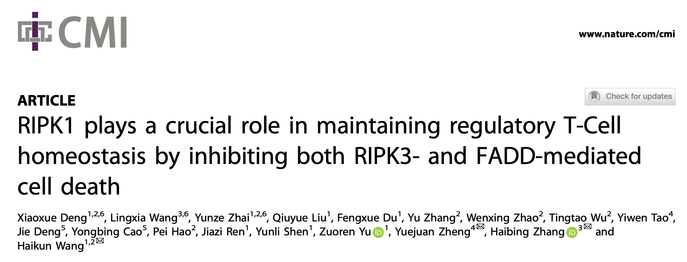 国际著名学术期刊Cellular & Molecular Immunology(SCI 1区,IF=24.10)在线发表了麦田影院 郑月娟课题组与同济大学附属东方医院王海坤课题组、中国科学院章海兵课题组合作的研究论文“RIPK1 Plays a Crucial Role in Maintaining Regulatory T Cell Homeostasis by Inhibiting both RIPK3 and FADD-Mediated Cell Death”,该研究发现受体相关蛋白激酶1(receptor-interacting protein kinase 1,RIPK1)在维持Treg细胞和常规CD4+ T细胞(Tconv)的稳态的机制不同,Treg细胞中RIPK1蛋白通过抑制FADD和RIPK3介导的凋亡和坏死促进Treg细胞的存活,而在常规CD4+ T细胞中,RIPK1主要通过抑制凋亡促进 CD4+ T细胞的存活。