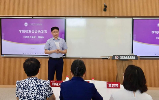 孟婉婷作为校友代表发言,深情回顾了自己在学校求学历程,感恩母校的培养。她期待和各位校友利用学院校友会的平台优势,续写友谊的新篇章,为母校的建设和中西医结合事业的传承贡献力量,