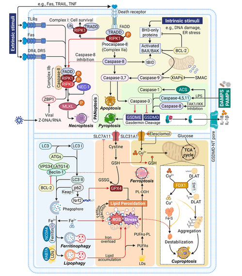 该综述系统梳理了常见PCD类型的发展历程及其在肿瘤中的分子机制,包括:凋亡(apoptosis)、坏死性凋亡(necroptosis)、自噬(autophagy)、焦亡(pyroptosis)、铁死亡(ferroptosis)、铜死亡(cuproptosis)以及新近发现的其他细胞死亡形式。文章不仅详细总结了它们在癌症进展、转移和治疗耐受中的双重作用,还重点阐述了不同PCD类型之间的交叉与分子互作网络。